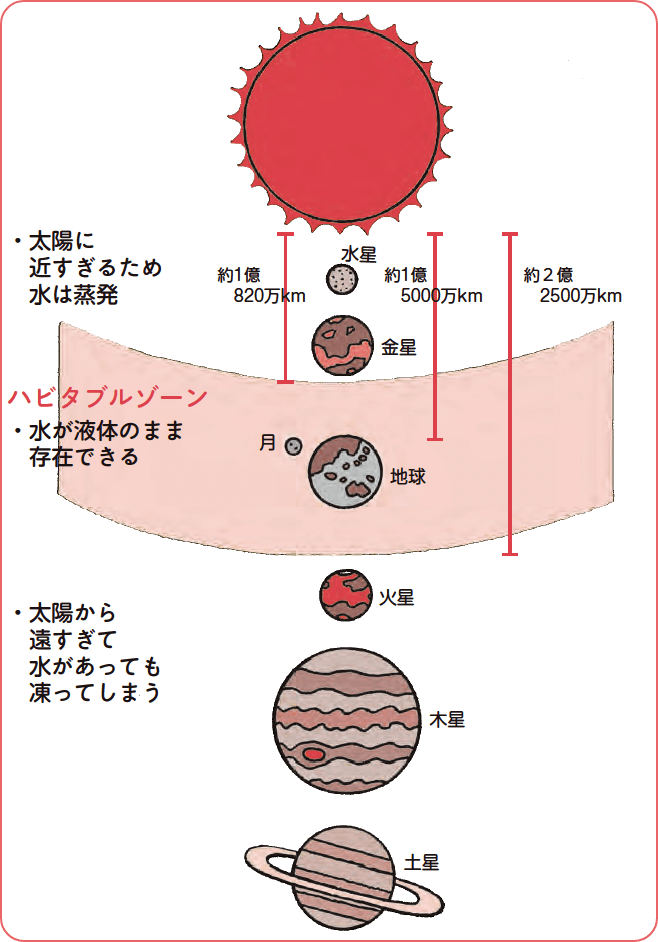 水は、一気圧では0度から100度の間でしか液体として存在できません。その点、地球は太陽とちょうどいい公転軌道半径であるため、この温度条件を備えることができているのです。地球より少し太陽に近い金星では、太陽に近すぎて表面温度が高温になり液体の水は存在できませんし、地球の外側を公転している火星では、表面の水は凍りついてしまいます。