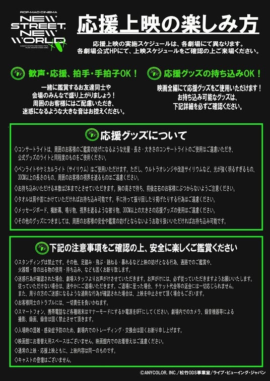 そして、映画を見ながら実際のライブのように楽しめる応援上映の実施も決定!一緒に鑑賞するお友達同士や、劇場にいる皆様で大いに盛り上がってください!応援上映の実施スケジュールは、各劇場によって異なります。ご覧になる劇場の上映スケジュールをご確認の上、下記注意事項を守って楽しくご鑑賞ください。