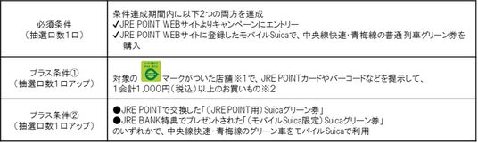キャンペーン期間中に以下の条件を達成されたお客さまの中から、抽選で10,000名様にJRE POINT1,000ポイント(期間限定ポイント)をプレゼントいたします。なお、プラス条件を達成すると、条件達成1つごとに抽選口数が1口アップし、最大3口までの抽選にご参加いただけます。