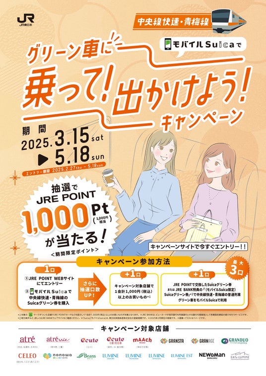 中央線快速・青梅線グリーン車サービス開始を記念し、モバイルSuicaで中央線快速・青梅線のグリーン券を購入されたお客さまを対象に、抽選でJRE POINTをプレゼントするキャンペーンを実施します。