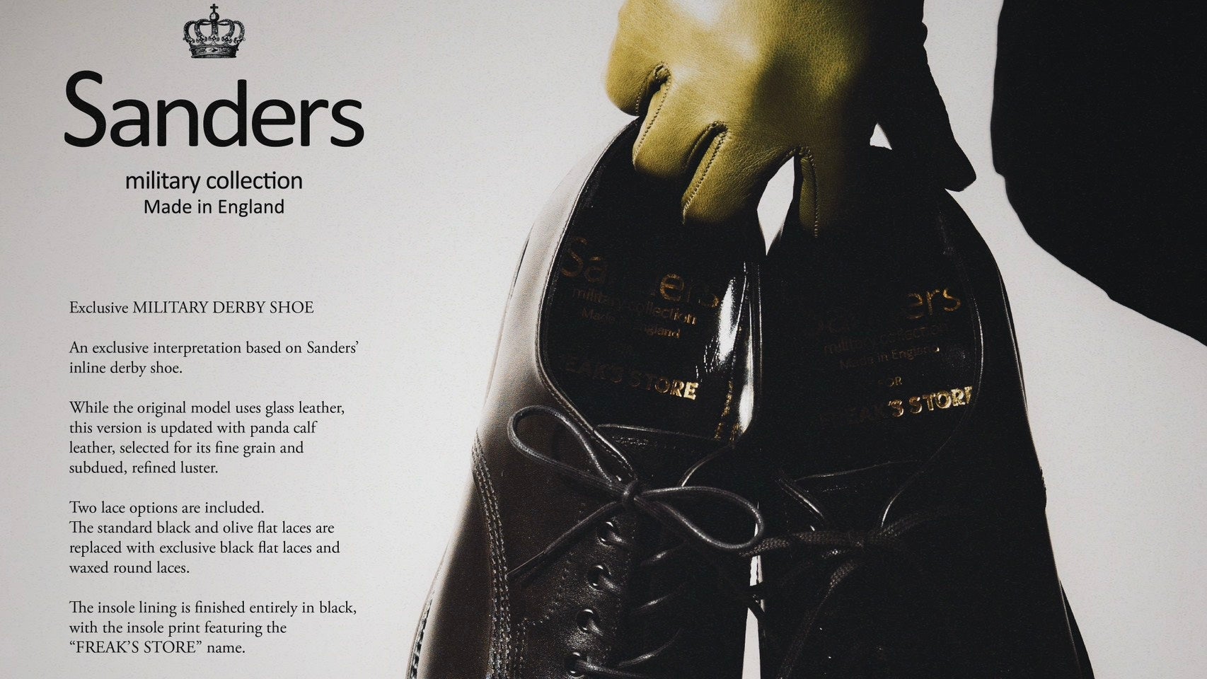 老舗シューメーカー「Sanders(サンダース)」にFREAK'S STOREが別注したシューズ"MILITARY DERBY SHOE"が登場。Sandersのインラインではよく見られる、光沢感のあるポリッシュドレザーをFREAK'S STORE別注ではマットな質感のパンダカーフに変更。シューレースは通常ブラックとオリーブの2色のフラットシューレースが付属するところ、ブラックのフラットシューレース・ブラックのラウンドレースを付属し、よりクラシックな表情で履ける仕様に仕上げました。またインソールのライニングをオールブラックに変更し、インソールのかかと部分には「Sanders」と「FREAK'S STORE」のダブルネームがプリントされた特別仕様になっています。