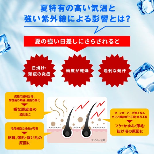 日本の夏(6~8月)の平均気温は統計開始以降過去最高となっており、それに伴い、年々紫外線量も増加しています。長期間、気温上昇や紫外線といった夏特有の外的要因にさらされた髪と頭皮は、日焼け、炎症、乾燥といったダメージを受け、それにより頭皮のかゆみ、かさつき、髪のパサつきといったトラブルを引き起こします。また、過剰な皮脂分泌により、独特なニオイが発生する場合もあります。