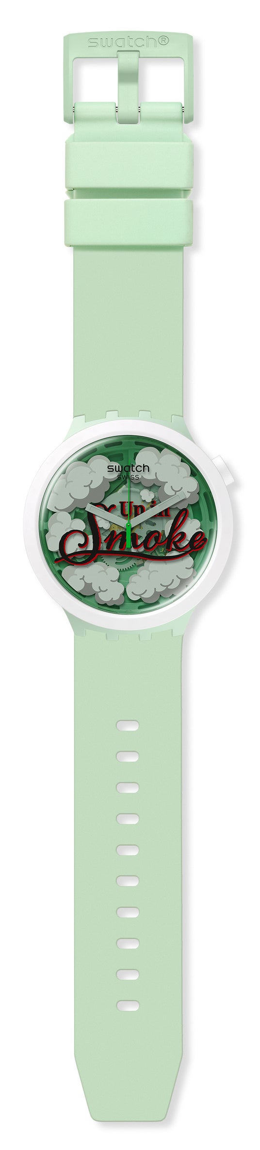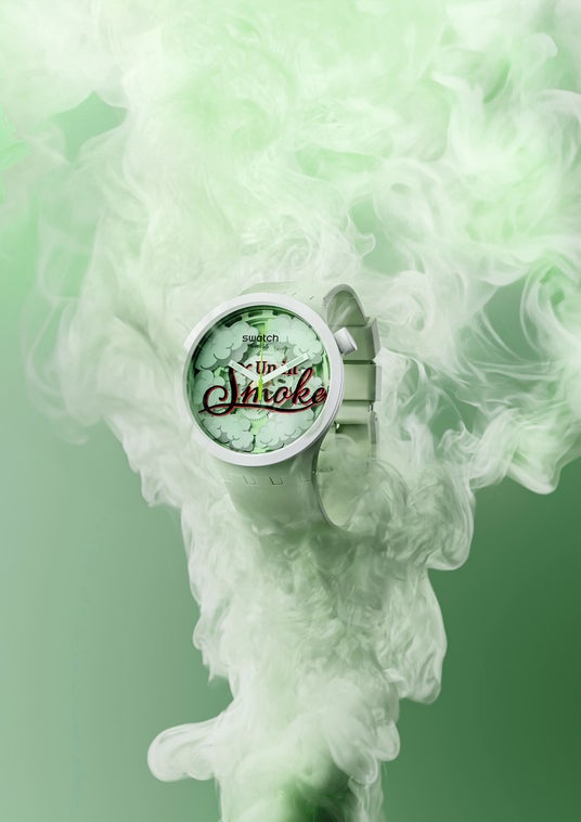 どの時計にもストーリーがありますが、その中には話題性のある時計があります。Swatchの最新作、UP IN SMOKEはまさにそんな時計です。Swatch の革新的な BIOCERAMIC が、ほとんど何とでもミックスできることを証明しているUP IN SMOKEは、ホットなデザイン、特徴的なグリーンの色合い、文字盤のモクモクとした煙、そしてまったりとリラックスした雰囲気を備えています。 ビッグで大胆な人向けにデザインされたこの47mmケースのBIG BOLDモデルは、まったりとしたリラックス気分で、 話題性を感じられる時計です。 UP IN SMOKEは9月27日から世界中のストアと swatch.com で販売されます。クールでしょ?最高。