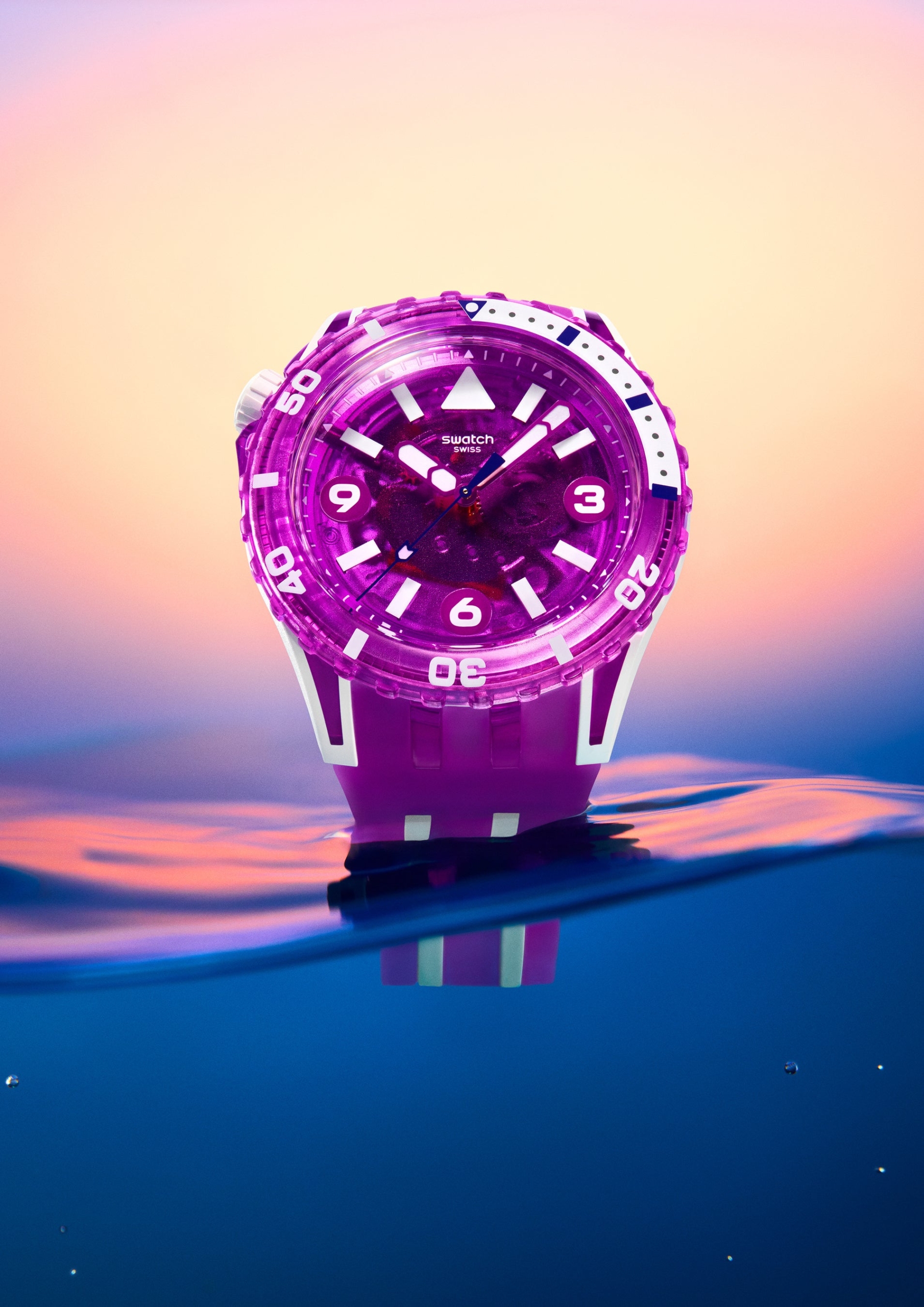 コレクションのほかのモデルと同様に、今回の新作も10時位置にリューズを配置し安全性を高めるとともに、ユニークなスタイルになっています。半透明の文字盤と44mmのケース、そして暗闇で光るディテールを組み合わせることで、どのような環境でも完璧な視認性を確保しつつ、10気圧防水の堅牢な設計は、SwatchのSCUBAウォッチの伝統を受け継いでいます。