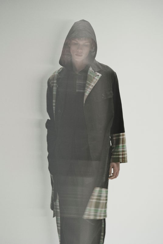 ワークテイストのディティールと、インドの織物にみられるマドラスチェックが特徴的な一重のコートに合わせるのは、同じくマドラスチェックを用いたオーバーサイズのフードシャツと3タックパンツ。