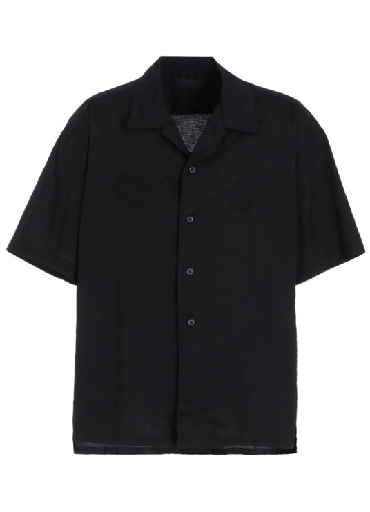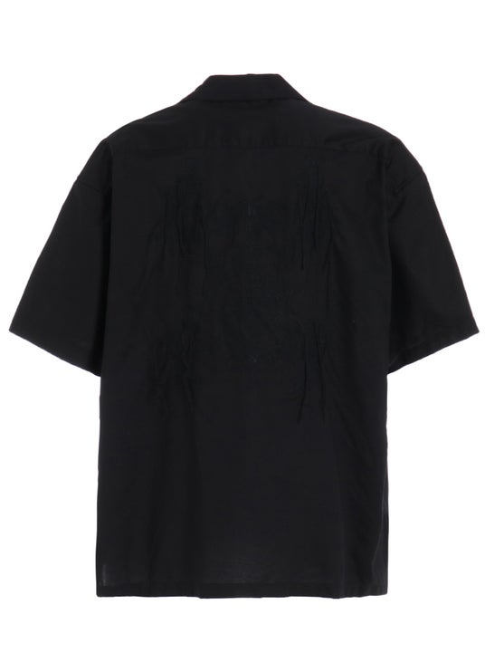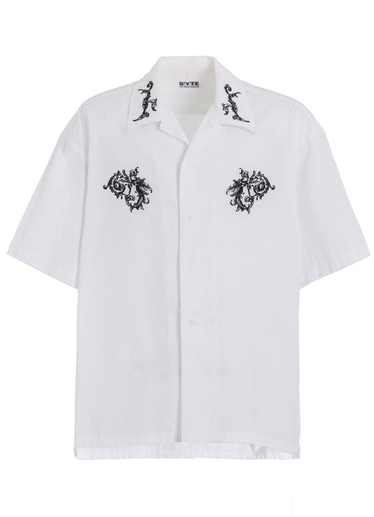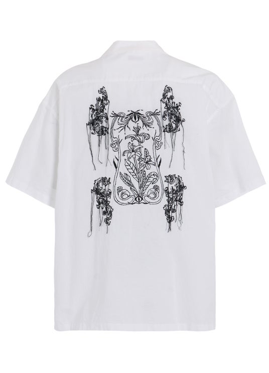 華麗で複雑な模様のバロック柄刺繍を襟、胸、背中に入れたオープンカラーシャツ。バックスタイルを飾る大きな構図の刺繍は1本1本の輪郭線にこだわり抜き、あえて刺繍糸を長く垂らすことで風に靡き、スタイリングのアクセントになる独特のニュアンスと華やかさが特徴となっています。
