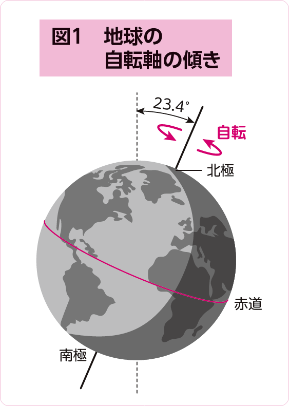 原因は、地球の自転軸が傾いている(図1)ことにあります。地球の自転軸は地球が太陽の周りをまわる公転面(黄道面)に垂直ではなく、垂直な方向から23.4度傾いています。