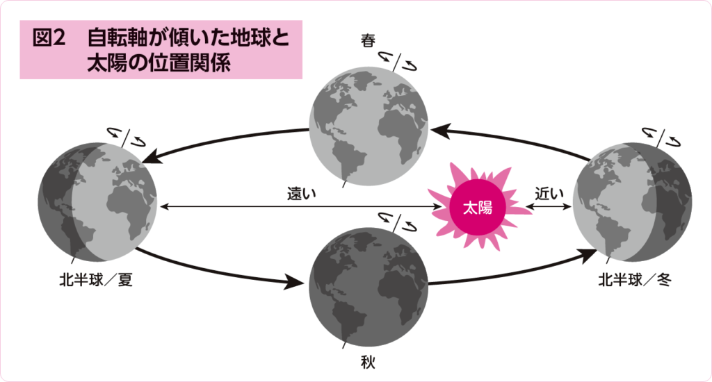 太陽の周りを地球が楕円を描きながら公転しているために、地球から太陽までの距離が一年を周期として変化することが原因なのでしょうか。季節は日本だけでなく世界中にあり、北半球が夏の時期に南半球では冬を過ごしていることを思い出してください。地球と太陽の距離の変化が季節の原因だとすると、北半球と南半球で一年の中で季節が逆になることを説明できません。