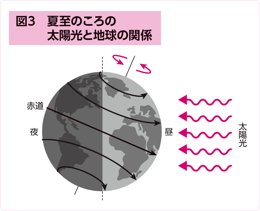 夏至のころには北緯23.4度の地点で太陽が真上に来ます。さらに昼間の長さも長くなり、北半球は太陽のエネルギーを南半球よりたくさん受ける(図3)ことになるのです。