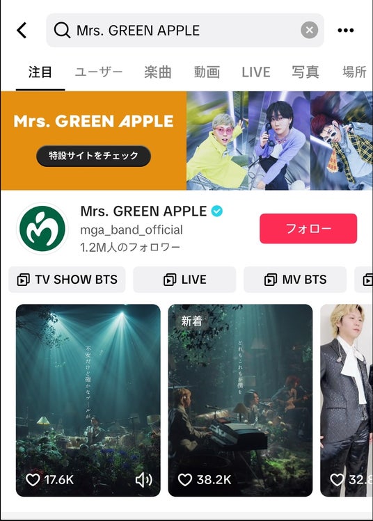 また、チャレンジの実施期間中には、日本人アーティストとしては初めて、アプリ内の検索結果で「検索バナー(Search Banner)」が表示され、検索バナーをクリックすると、Mrs. GREEN APPLEの特設サイトを閲覧することが可能です。特設サイトでは、Mrs. GREEN APPLEのTikTokでしか見ることができない動画を含め、さまざまな動画投稿をお楽しみいただけます。