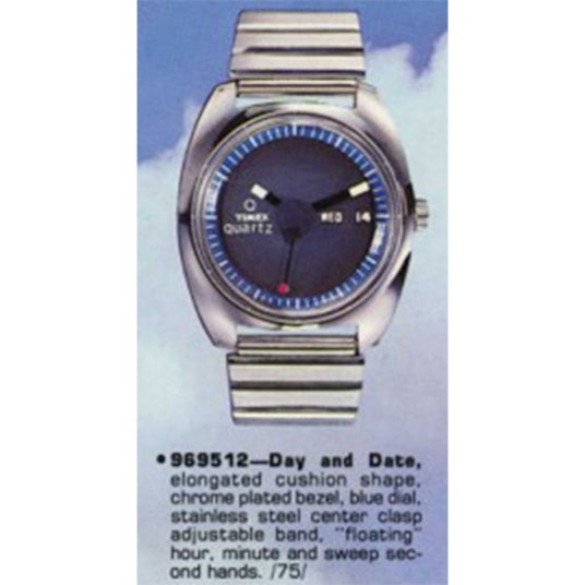 タイメックスもその例に漏れず、ミッドセンチュリー期を経た1975年、当時まだ新しかったクォーツラインから、「クッションシェイプ」と呼ばれる37mm幅のステンレススチール製ケースにブレスレットを合わせ、時針、分針、秒針が浮いているように見える「フローティング」というギミックのデザインを採用し、品番「969512」として発売しました。