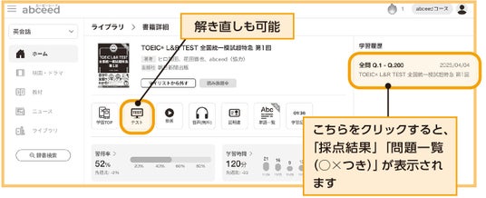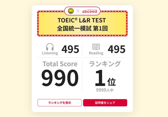 受験資格は、書籍『TOEIC L&R TEST 全国統一模試超特急 第1回』を購入し、同封されているシリアルコードを入手するか、abceed「Proプラン」の会員となるかで得られます。模試問題は、1アカウントにつき1回のみ受験でき、AIによる予測スコアが判定されます。総受験者中何位であるか、ご自身のランキングもわかります。受験者のAIスコアとランキング証明書を発行することもできます。