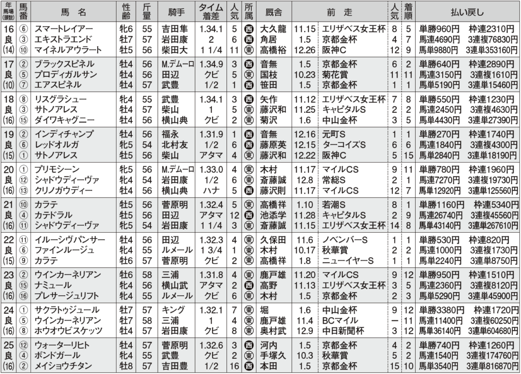 次いで多いのが格上のマイルCS組で[2・0・1・13]だが、①~⑤人気が10頭いることを考えれば、手を出しづらい。