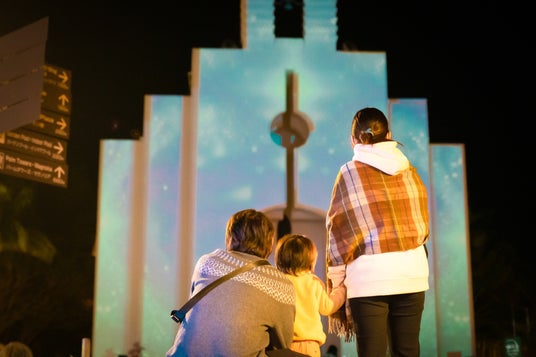 ステラパークアベニュー:カヌチャステラ教会を囲む光のブランコやハートのトンネル、粉雪と音楽のライトアップショーで感動を!