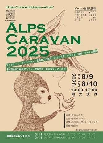 長野県塩尻市の信州塩尻農業公園 チロルの森が、2025年8月9日(土)・10日(日)にグランドオープン後初の大型アンティークマーケット「ALPS CARAVAN 2025」を開催! 標高1,000mの涼しい高原で、アンティーク雑貨やクラフト、絶品グルメを楽しむ2日間。 全国から200以上のショップが集結し、宝探しのようなワクワクと美味しいひとときが待っています! 家族や友達と一緒に、夏の思い出を作りに出かけよう!