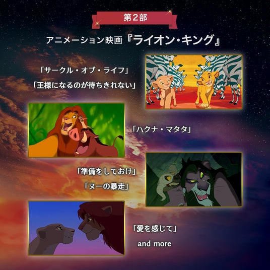 - 演奏曲: 「サークル・オブ・ライフ」「王様になるのが待ちきれない」「準備をしておけ」「ヌーの暴走」「ハクナ・マタタ」「愛を感じて」など