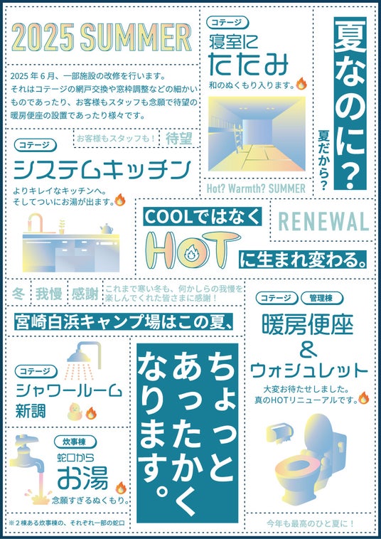 宮崎県宮崎市の「宮崎白浜オートキャンプ場」が、2025年7月に大規模リニューアルを完了!コテージは最大8名対応に拡張され、キッチン、シャワールーム、トイレが全面刷新、寝室は温かみのある畳フロアに。共用トイレにはウォシュレットと暖房便座、炊事棟には給湯設備を導入し、快適性が大幅アップ。青島近くの南国ムード漂う海辺で、家族や仲間とリフレッシュする最高のキャンプを!予約は公式サイトで今すぐチェック!