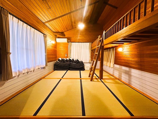 - 設備詳細:上段にベッド2名分+畳フロア(布団あり)、テラス、Wi-Fi完備。※テレビなし、未就学児は布団提供なし。