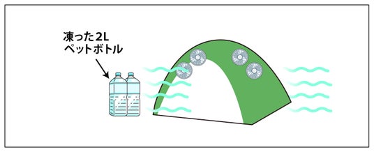 テント設営は風の通り道を意識!風通しの良い場所を選ぶと、テント内の熱気が逃げ、夜の寝苦しさが軽減。スタッフ実践の暑さ対策は、充電式扇風機をテント内に吊るし、凍らせたペットボトルを入口に置く方法。電源サイトなら家庭用扇風機も活用可能で、朝まで快適な涼しさをキープできました!