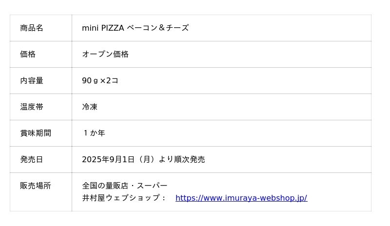 井村屋から、手軽なのに本格的な味わいが楽しめる冷凍ピザ**「mini PIZZA ベーコン&チーズ」**が、2025年9月1日(月)より全国で発売されます。