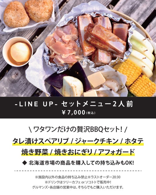 BBQセットには、人気店の味を集めた豪華なラインナップが用意されています。タレ漬けスペアリブ、ジャークチキン、北海道産のホタテなど、食欲をそそるメニューが勢揃い。ドリンクは施設内で購入できるため、本当に手ぶらでOK!家族や友人、カップルでシェアしながら、最高の食事を楽しめます。