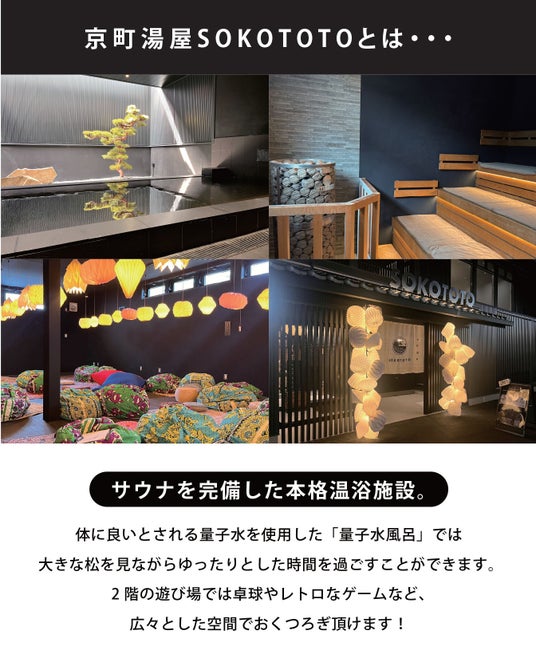 BBQでお腹を満たした後は、温浴施設「京町湯屋SOKOTOTO」でリフレッシュ。話題の量子水風呂や本格サウナで、心と体を“ととのえる”ことができます。さらに、当日の様子をInstagramでシェアすると、入浴&サウナが無料になる特典も!
