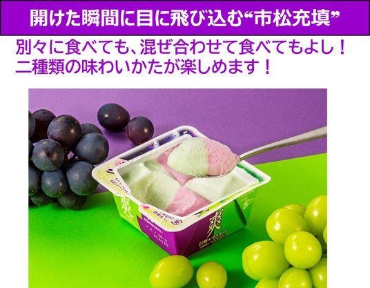 - 見た目も楽しい市松模様: 巨峰とマスカットのアイスが市松模様に詰められており、見た目のインパクトも抜群です。別々に食べたり、混ぜて食べたりと、食べ方によって異なる味わいを楽しめます。