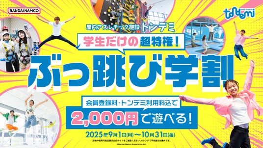 屋内アスレチック施設**『トンデミ』が、2025年9月1日(月)から10月31日(金)まで、「学生だけの超特権!ぶっ跳び学割」**キャンペーンを実施します。