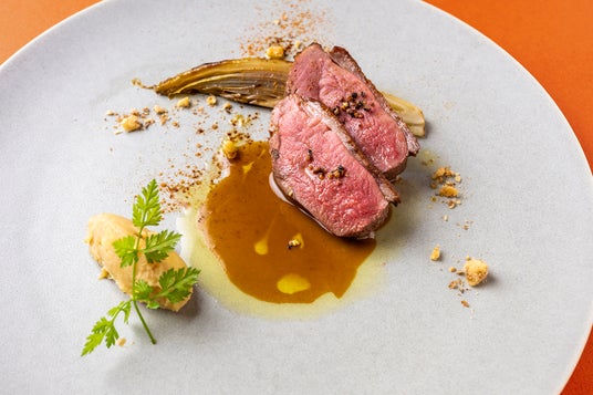 ロゼ色にローストしたあいち鴨肉に、豊潤なりんごの香りのシードルとアップルバルサミコのソースを合わせて。