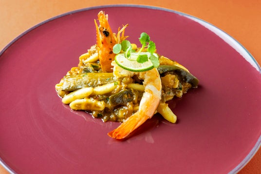 南イタリアのショートパスタ“カヴァテッリ”に、海老と秋茄子のラグーソースを合わせ、天使の海老のソテーを飾った一品。