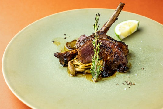 骨付きの仔羊肉を八丁味噌で軽くマリネし、さくらのチップで燻製してから焼き上げました。季節の茸のソテーを添えて。