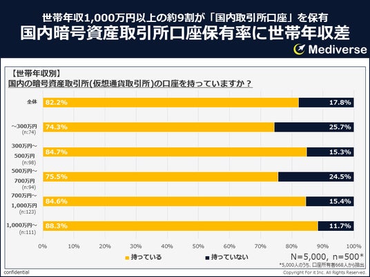 Web3メディア「Mediverse」を運営する株式会社フォーイットが、国内の暗号資産(仮想通貨)取引所に関する大規模な調査を実施。性別や年代、世帯年収別に利用者の傾向を分析した結果、興味深い事実が明らかになりました。