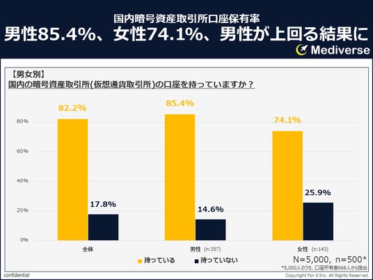 国内の暗号資産ウォレット保有者500人を対象とした調査で、国内取引所の口座を**「持っている」と答えた人は8割以上**。その中でも、男性(85.4%)は女性(74.1%)よりも口座保有率が高いことが判明しました。