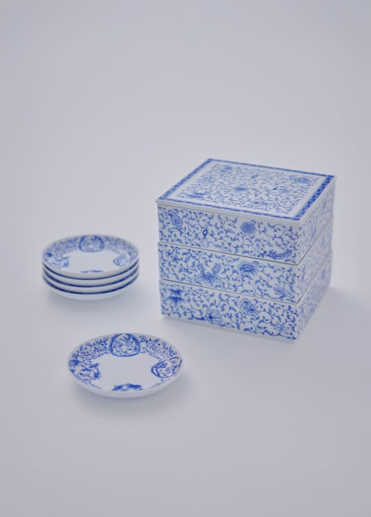 - 辻精磁社の器: 呉須の青を長年守り続けてきた辻精磁社が、このおせちのために制作した特別な三段重。蓋には松屋の「松」の模様が施され、四君子や四季の自然が優美に描かれています。