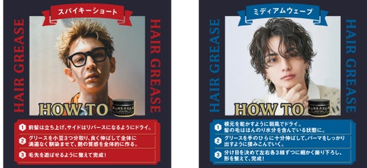 新しいパッケージは、ブラックとゴールドを基調としたリッチで風格のあるデザインに一新。パーマからスパイキーショートまで、幅広いスタイルに対応するこだわりのグリースを、この機会にぜひお試しください。