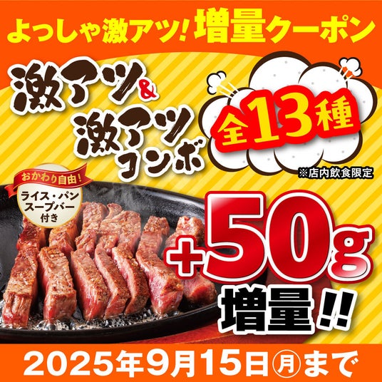 このクーポンを使えば、対象の「激アツステーキ」や「激アツコンボ」が、なんとお値段そのまま50g増量で楽しめます。