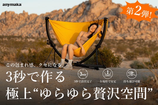 「ハンモックは好きだけど、場所を取るし設置が大変…」そんな悩みを解決する、画期的なハンモックチェアが日本に初上陸しました。海外で累計1.5億円を売り上げた大ヒットモデル「anymaka ポータブルスウィングチェア」が、応援購入サービス「Makuake」で先行販売中です。