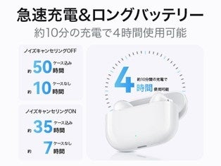 イヤホン単体で最大10時間、充電ケースを併用すれば最大50時間の音楽再生が可能。充電を気にせず、長時間にわたって音楽を楽しめます。また、10分の充電で約4時間再生できる急速充電にも対応しています。