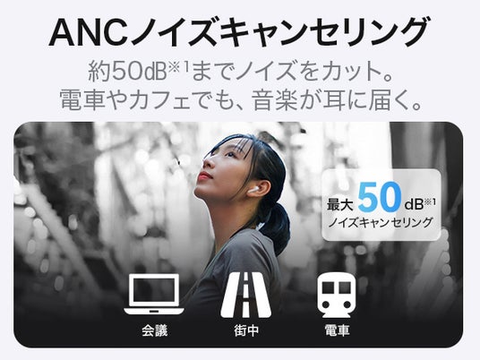 地下鉄やバスの中といった騒がしい場所でも、周囲のノイズを最大50dBまでカット。音楽や動画、通話に集中したい時に、ノイズの少ないクリアな環境を作り出します。ノイズのレベルに合わせてモードが自動で切り替わるため、常に最適な状態で使用できます。