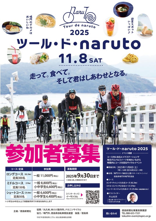 徳島新聞社は、鳴門市の地元グルメを楽しみながらサイクリングを楽しむイベント**「ツール・ド・naruto 2025」を、2025年11月8日(土)に開催します。ゲストライダーとして、元F1ドライバーの片山右京氏**が参加し、トークイベントも開催される予定です。