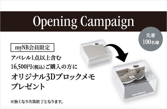 - オリジナル3Dブロックメモをプレゼント: 期間中、アパレルを含む16,500円(税込)以上ご購入のmyNB会員様先着100名様に、オリジナルの3Dブロックメモをプレゼントします。