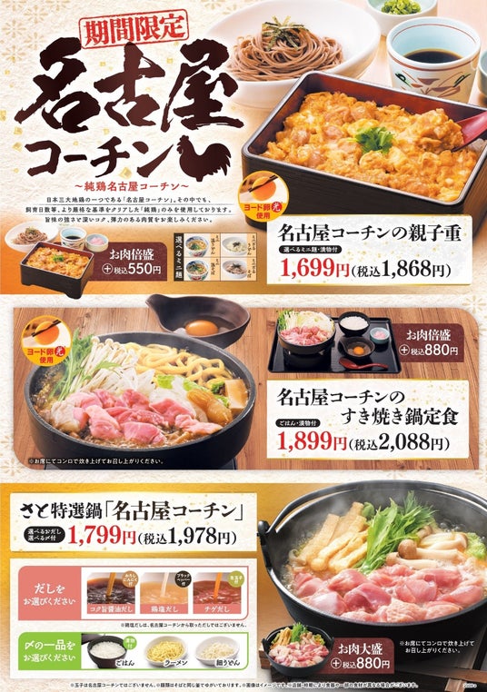 和食レストラン「和食さと」が、2025年9月4日(木)から10月15日(水)までの期間限定で、名古屋コーチンフェアを開催します。