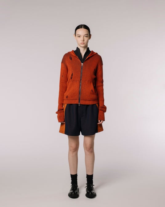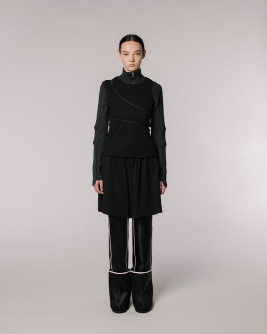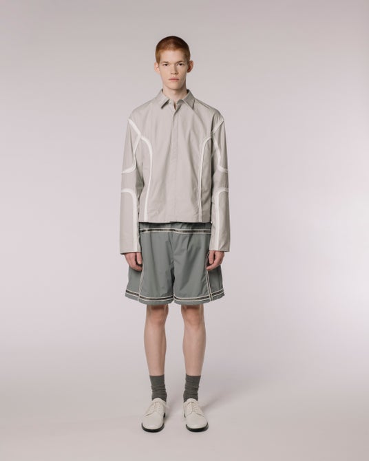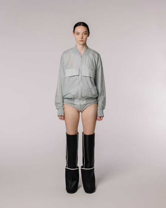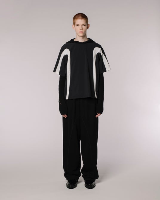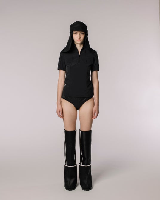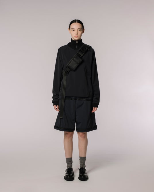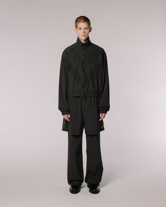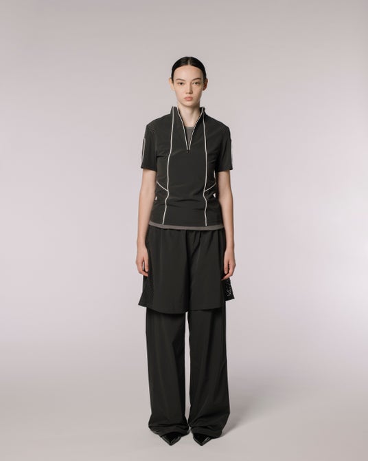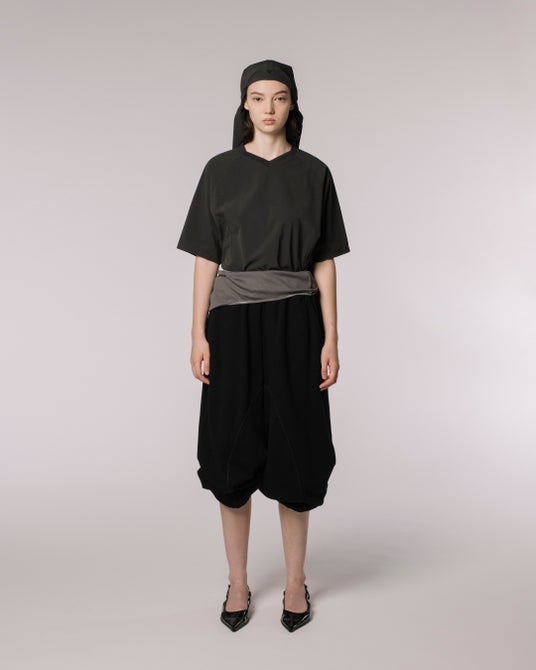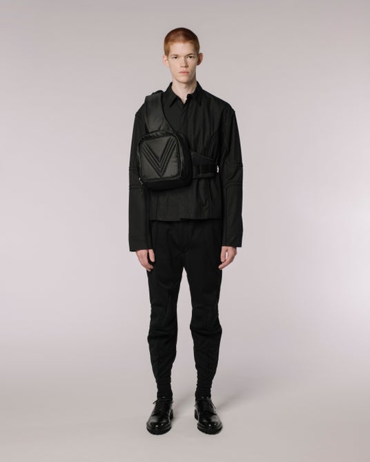 カラーは黒とグレーを基調に、素材にはジャージーやナイロンタフタを使用。ブランドの象徴であるバンブルビー(マルハナバチ)とシェブロンモチーフは、生地と同系色の刺繍で控えめに表現され、衣服の構造そのものが際立つミニマルな美しさを放っています。