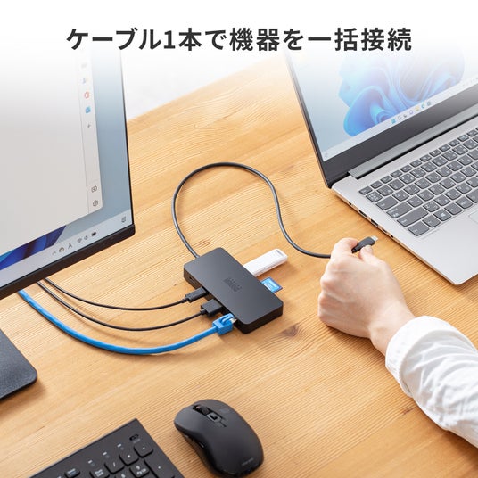 これ一つで、ディスプレイ、有線LAN、USB機器を同時に接続できる、快適なマルチ拡張環境を簡単に構築できます。