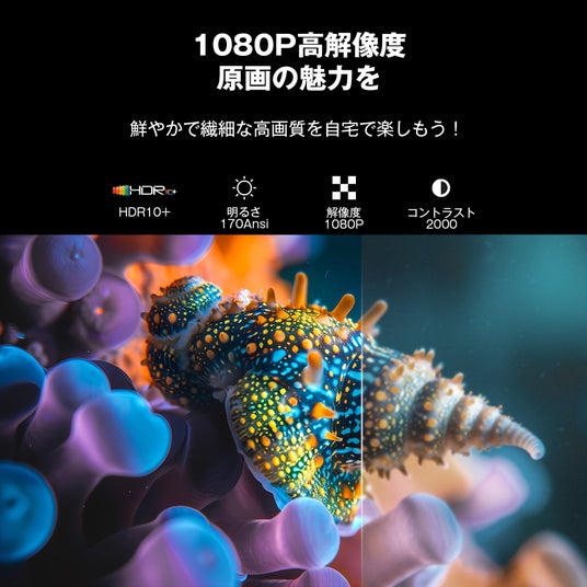このプロジェクターは、自宅の壁に映すだけで、映画やドラマを大画面で楽しめます。4Kデコードに対応し、170ルーメンの高輝度で、鮮明で迫力のある映像を体験できます。
