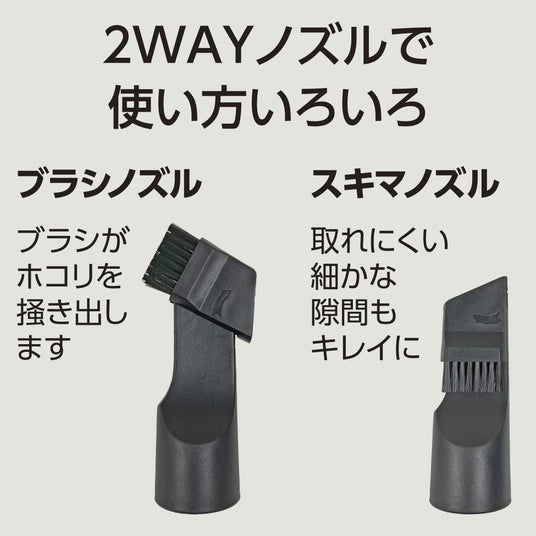 - 2WAYノズル:サッシの隙間や棚の隅など、掃除しにくい場所のゴミを掻き出すのに便利です。