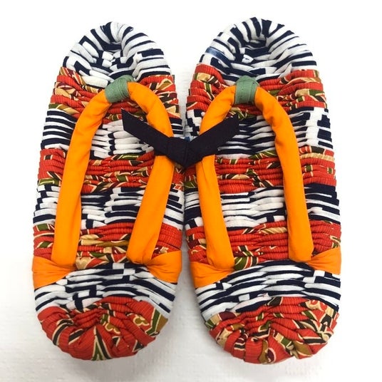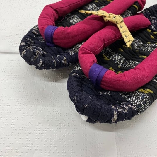 素材は再生着物(絹・綿・ポリエステル等)。寄贈着物から生まれる一足。