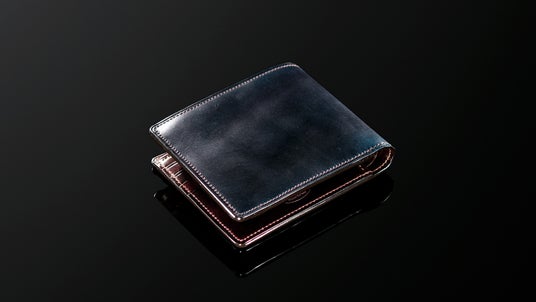 この二つ折り財布は、外装と内装の両方にシェルコードバンを使用。札入れ2室、小銭入れ1室、カードポケット4室など、コンパクトながらも使い勝手の良い機能性を備えています。