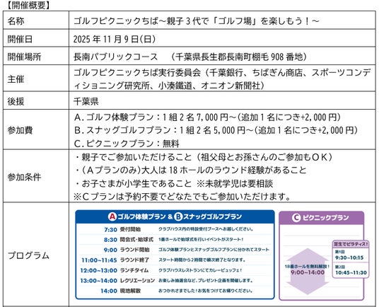 千葉銀行が中心となって、初心者や未経験者、子どもも楽しめる新しいゴルフイベント**「ゴルフピクニックちば」**を開催します。11月9日(日)、千葉県長生郡にある「長南パブリックコース」を貸し切って、特別な一日を過ごせます。
