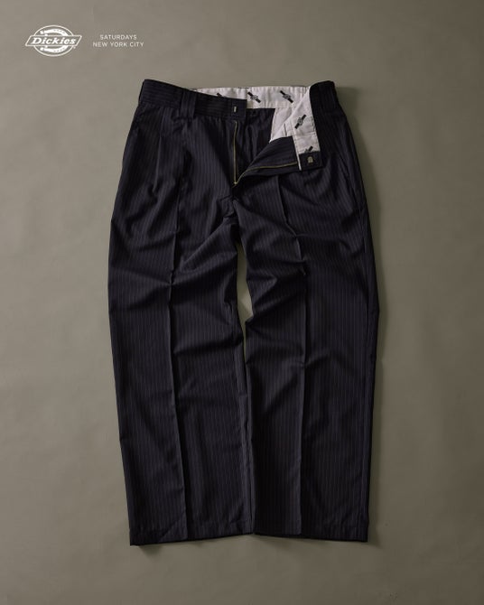 - Saturdays NYC x Dickies 875 Slacks 涼しげなストライプ柄が特徴的なスラックスモデルです。軽量で通気性に優れた生地とゆったりとしたワイドシルエットで、快適な履き心地を実現。カジュアルになりすぎず、洗練された印象を与えてくれるので、様々なシーンで活躍します。 - 価格: 23,100円(税込)